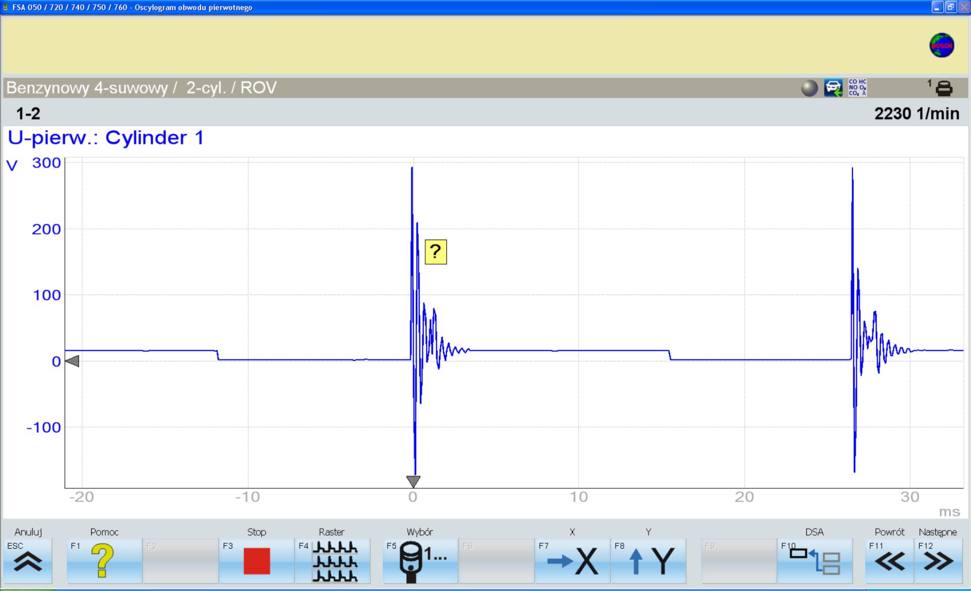 Dłuższego pochylenia się nad tematem wymagał również sygnał „synchronizujący” wtrysk paliwa do cylindra – napięcie powstające na przerywaczu aparatu zapłonowego (po stronie pierwotnej cewki zapłonowej). Wynosi ono bowiem ok. 300 V oraz nie jest sygnałem logicznym, a wręcz stanem nieustalonym wynikającym z wymiany energii między uzwojeniem cewki, a kondensatorem. Przykładowy oscylogram takiego przebiegu przedstawiam poniżej (pochodzi on z układu Motronic ML, którego pomiary przeprowadzałem).