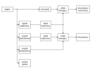 Dodatkowo na przodzie tablicy wyprowadzono złącze diagnostyczne systemu, którym odczytałem i zapisałem parametry wraz z ich wpływem na korekty czasu wtrysku. Pozyskawszy te dane utworzyłem schemat blokowy i zabrałem się za tworzenie schematu ideowego.