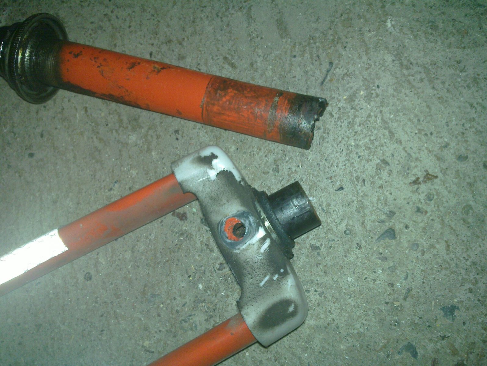 Po złamaniu trzeciego widelca zleciłem wspawanie rury grubościennej wewnątrz rury sterowej oraz wzmocnienie goleni. Rozwiązanie to sprawdziło się, jednak stwierdziłem, że oryginalne hamulce nie zapewniają mi siły hamowania pozwalającej na jazdę bez tzw. „duszy na ramieniu”.