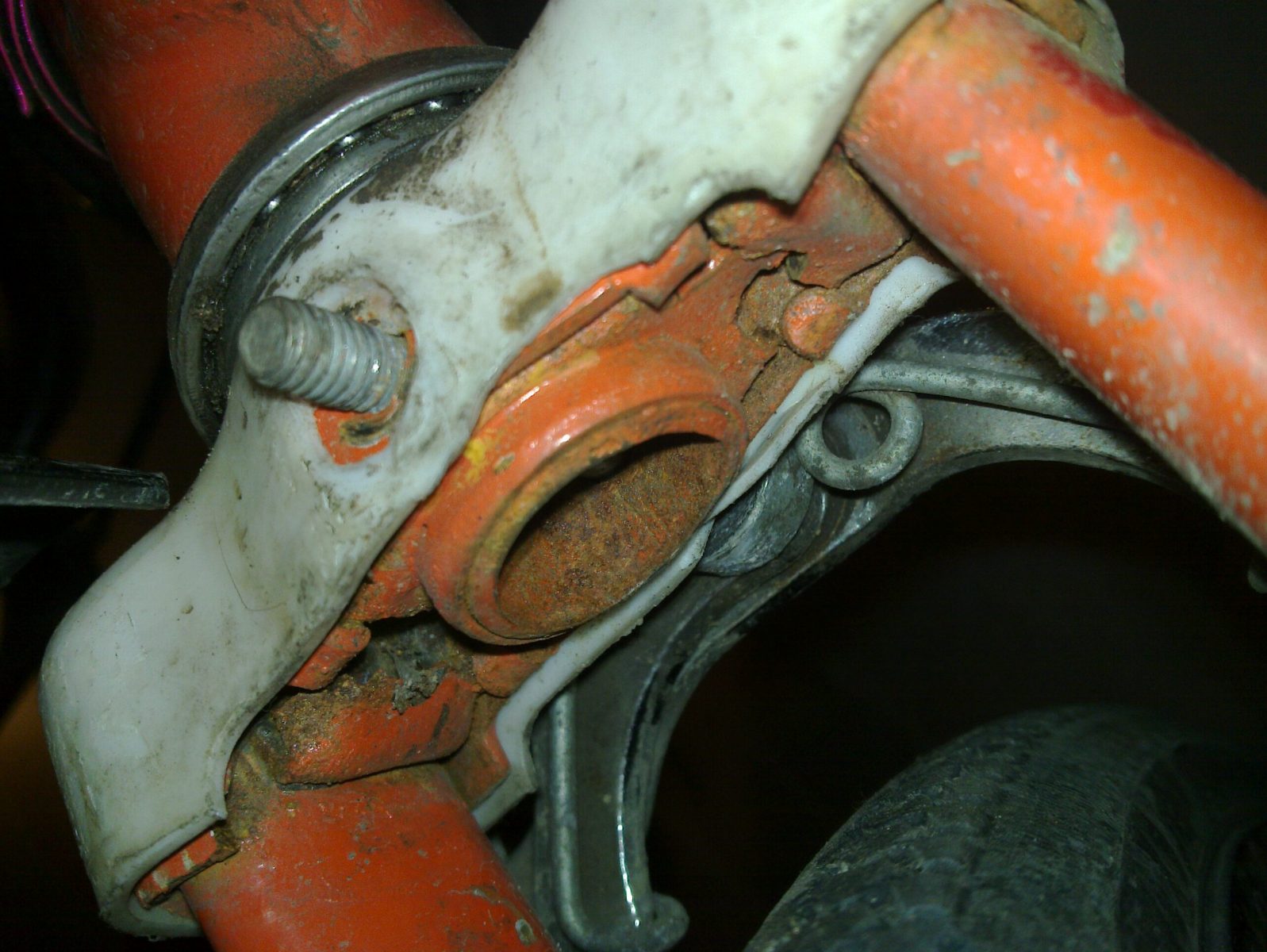 Po złamaniu trzeciego widelca zleciłem wspawanie rury grubościennej wewnątrz rury sterowej oraz wzmocnienie goleni. Rozwiązanie to sprawdziło się, jednak stwierdziłem, że oryginalne hamulce nie zapewniają mi siły hamowania pozwalającej na jazdę bez tzw. „duszy na ramieniu”.